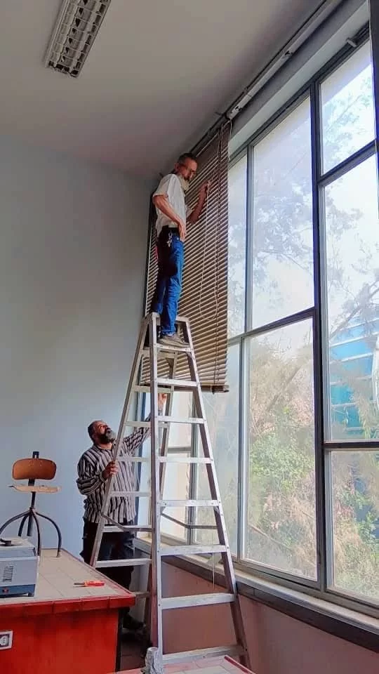 جانب من أعمال صيانة بعض مرافق الكلية هذا اليوم الأحد 4/5/2025 شملت صيانة بعض أجهزة التكييف وتوريد وتركيب ستائر لبعض المكاتب بالأقسام العلمية شارك فيها الشباب موظفي الكلية... تحية للرجال.