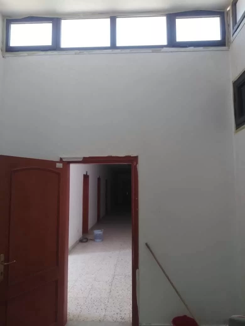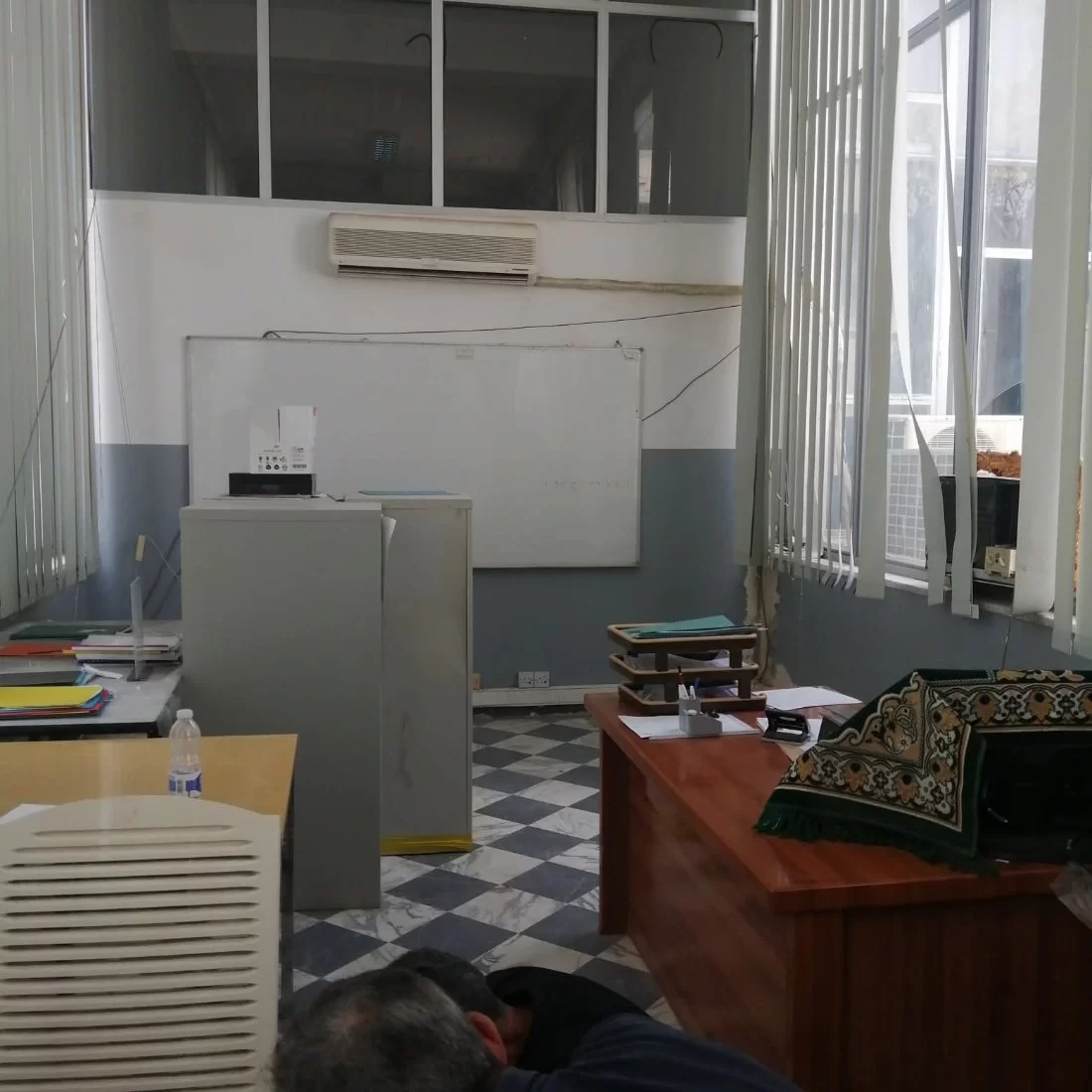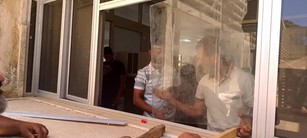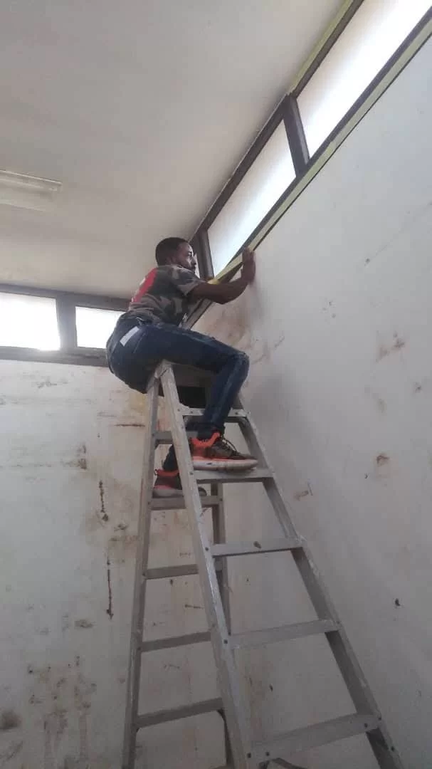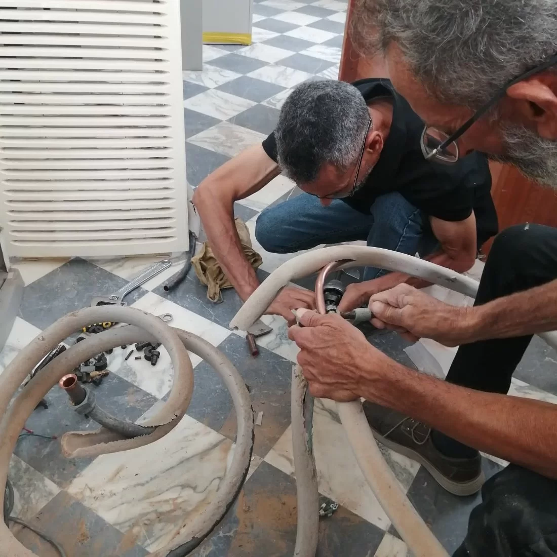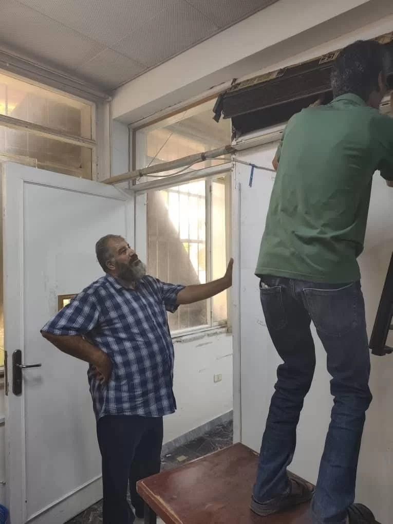 *أعمال صيانة وتركيب أجهزة التكييف في الطابق العلوي رغم خطورة التنفيد نظرا لعدم توفر المعدات اللازمة.