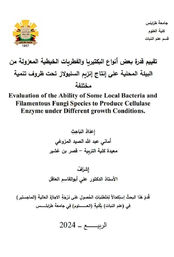 بعنوان: تقييم قدرة بعض أنواع البكتريا والفطريات الخيطية المعزولة من البيئة المحلية على إنتاج إنزيم السليولاز تحت ظروف تنمية مختلفة.