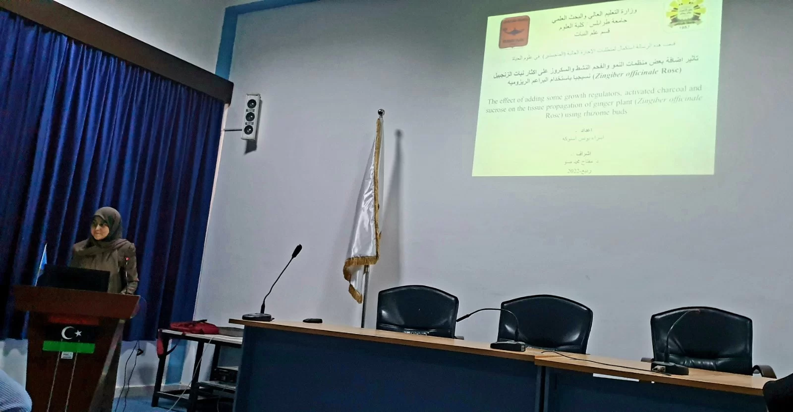 تم اليوم الاثنين 2022/7/25 علي تمام الساعة 10صباحا بقاعة المناقشة في قسم علم الحيوان عرض حلقة النقاش الثانية لرسالة الإجازة العالية ( الماجستير) بعنوان تأثير اضافة بعض منظمات النمو والفحم النشط والسكروز علي اكثار نبات الزنجبيل نسيجيا بإستخدام البراعم الريزومية (Zingiber officinale Rose )