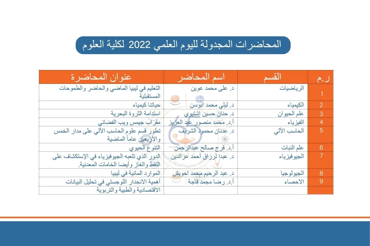 عقد صباح اليوم الأحد الموافق 24/ابريل/2022 بقاعة الاجتماعات الرئيسية بكلية العلوم اجتماع ضم كلاً من الاستاد الدكتور رمضان الجدي عميد كلية العلوم،الاستاد الدكتور ربيعة الغزير وكيل كلية العلوم للشؤون العلمية والسادة والسيدات اعضاء اللجنة العليا للاحتفالية وكذلك اللجان الفرعية المنبتقة عنها وقد تم ا