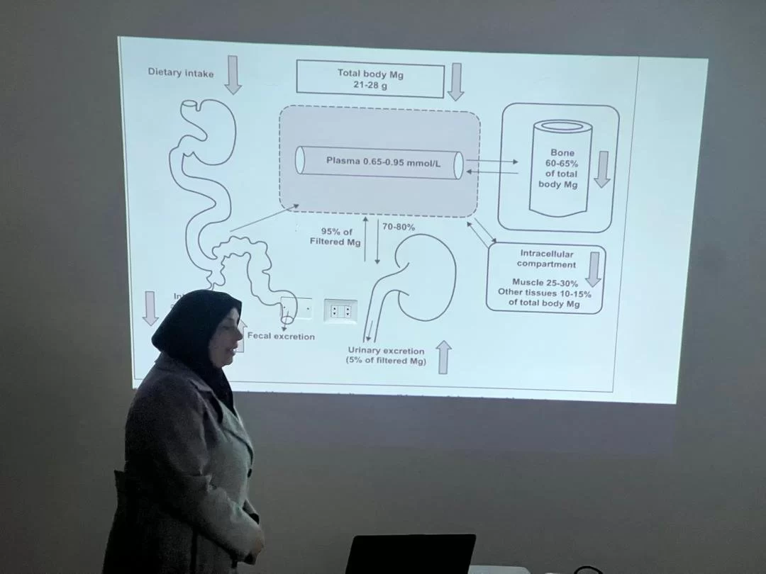 بعد ذلك، قدمت الطالبات حفصة الإمام، وليلى بن رمضان، وميادة عامر، تحت إشراف البروفيسور فرج التائب، أستاذ الكيمياء الحيوية بالمركز، ثلاث محاضرات تناولت موضوع "علاقة المغنيسيوم بالتوازن والأمراض". وقد أظهر الطلبة براعة واضحة في تقديم عروضهم، مما عكس تفانيهم واجتهادهم في هذا المجال العلمي الحيوي. كما تم تسليط الضوء على دور المغنيسيوم كعنصر أساسي في العديد من العمليات الحيوية وتفاعلات داخل الخلية.