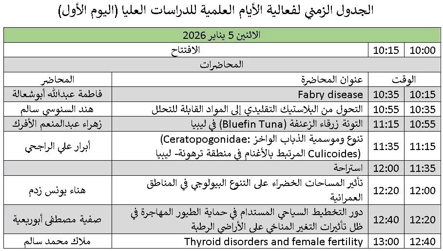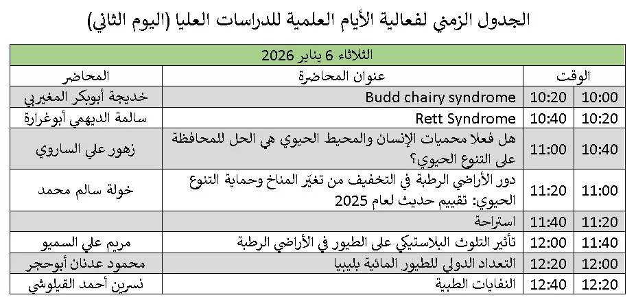 يقوم قسم علم الحيوان هذه الايام بنشاط علمي مميز بعنوان ((الايام العلمية للدراسات العليا)) يستهدف طلاب الدراسات العليا لتنشيط مهارات الاعداد والعرض والالقاء لطلاب الدراسات العليا تحت اشراف أ. د. الطاهر الشايبي رئيس لجنة الدراسات العليا بالقسم ومتابعة أ. د. طارق الجديدي رئيس قسم علم الحيوان.