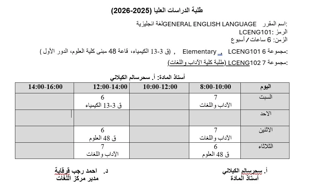 الجداول الدراسية لبرنامج اللغة بكلية العلوم لفصل الربيع 2026م