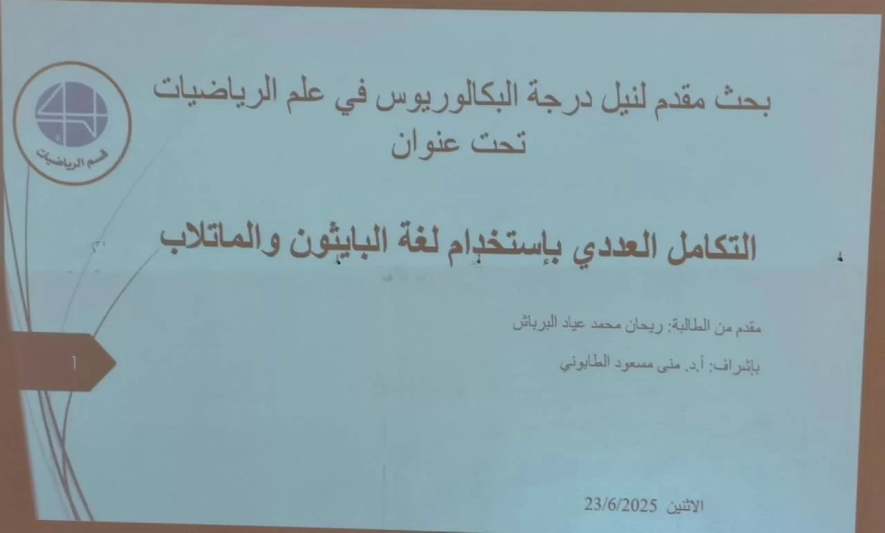 لقد تم مناقشة مشاريع تخرج طالبات قسم الرياضيات وذلك لعدد خمسة من الطالبات المتميزات خُلقاً وعلماً في صباح يوم الاثنين، بتاريخ 23 /06/ 2025، على تمام الساعة التاسعة .