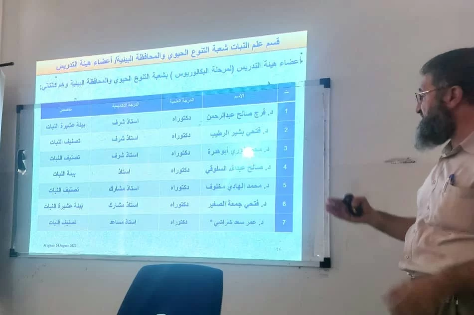 في اطار تحديث وتطوير مناهج الأقسام بالكلية لمواكبة التطور الذي توليه اهتماما كبيرا وكذلك الاعداد والتجهيز للاعتماد البرامجي، بقاعة الدراسات العليا بقسم الاحصاء اجتمعت يوم الخميس الموافق 24 اغسطس 2023 لجنة المناهج بالكلية برئاسة د. جمال اندير وكيل الكلية ورئيس لجنة المناهج، وذلك لمناقشة المناهج التي تقدم بها قسم علم النبات للاعتماد.