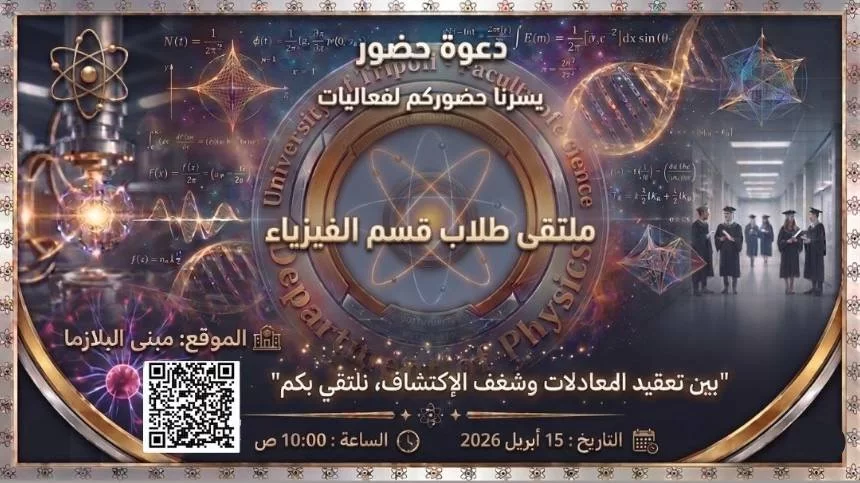 لو كنت طالب جديد في قسم الفيزياء، ومحتار وعندك أسئلة فهذا الملتقى نقطة انطلاقك. ولو كنت طالب متقدم أو خريج، فوجودك يعني دعم كبير لطلبة الجدد، وفرصة ثمينة لمشاركة خبرتك. أما لو كنت من المهتمين بمتابعة فعاليات القسم ولو أونلاين، حتى أنت مرحب بيك! لقائنا بيكم حيكون فرصة للتعارف كعائلة واحدة، الاستمتاع بأجواء مختلفة، الإستفادة والإفادة، والانطلاق في فصل دراسي جديد بدعمكم وحضوركم! يوم الأربعاء الموافق 15/4/2026 الساعة العاشرة صباحاًمسرح مبنى البلازما