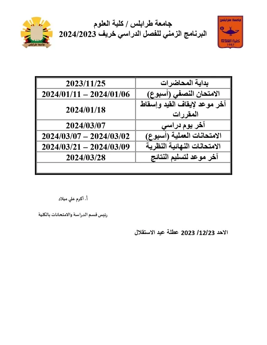 البرنامج الزمنـي وجدول الإمتحانات النصفية والنهائية لفصل الخريف 2023م