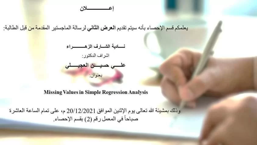 سيتم تقديم العرض الثاني لرسالة الماجستير المقدمة من قبل الطالبة / نادية الشارف الزهراء تحت اشراف أ.د. علي حسن العجيلي ، وذلك بمشيئة الله تعالى يوم الاثنين الموافق 20/12/2021 على تمام الساعة العاشرة بقسم الاحصاء