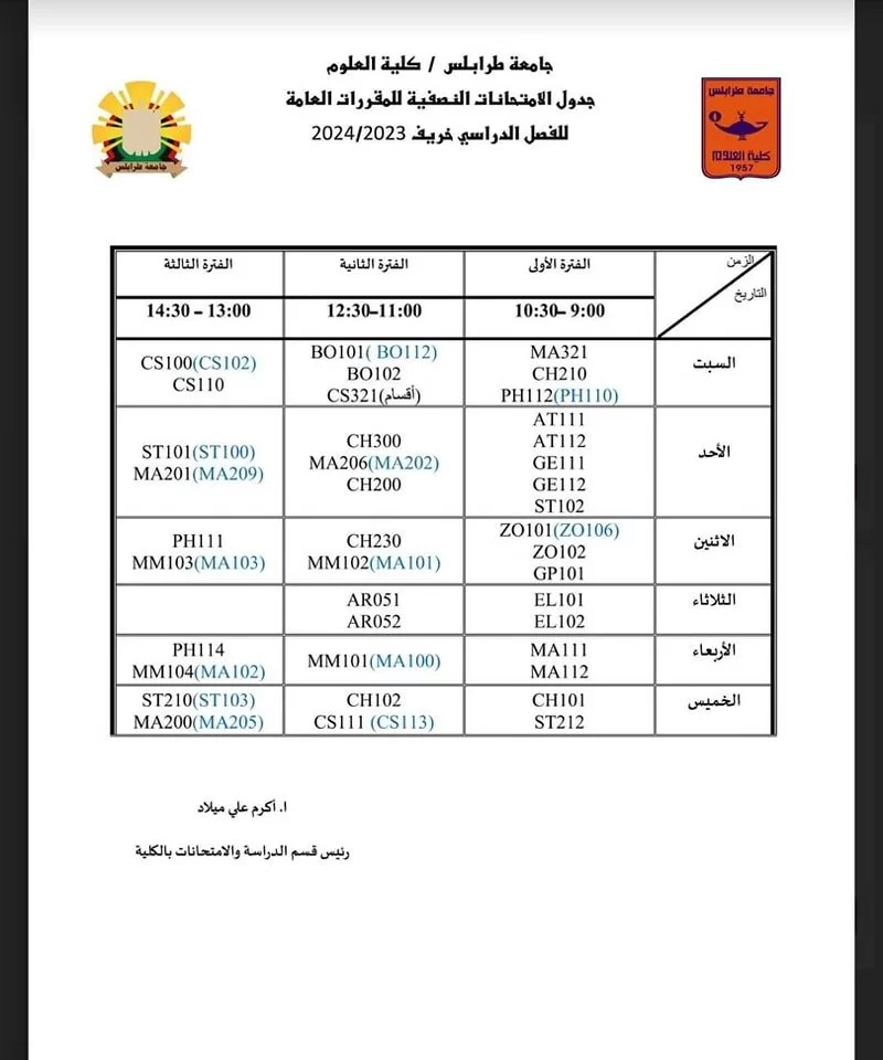 البرنامج الزمنـي وجدول الإمتحانات النصفية والنهائية لفصل الخريف 2023م