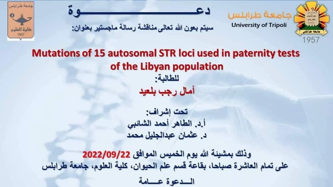 بناءا على قرار السيد رئيس الجامعة رقم (2027) لسنة 2022 ، تم صباح اليوم الخميس الموافق 22 سبتمبر 2022م ، مناقشة رسالة الماجستير لطالبة الدراسات العليا بقسم علم الحيوان أمال رجب بلعيد محمد وعنوانها " Mutations of 15 autosomal STR loci used in paternity tests of the Libyan po