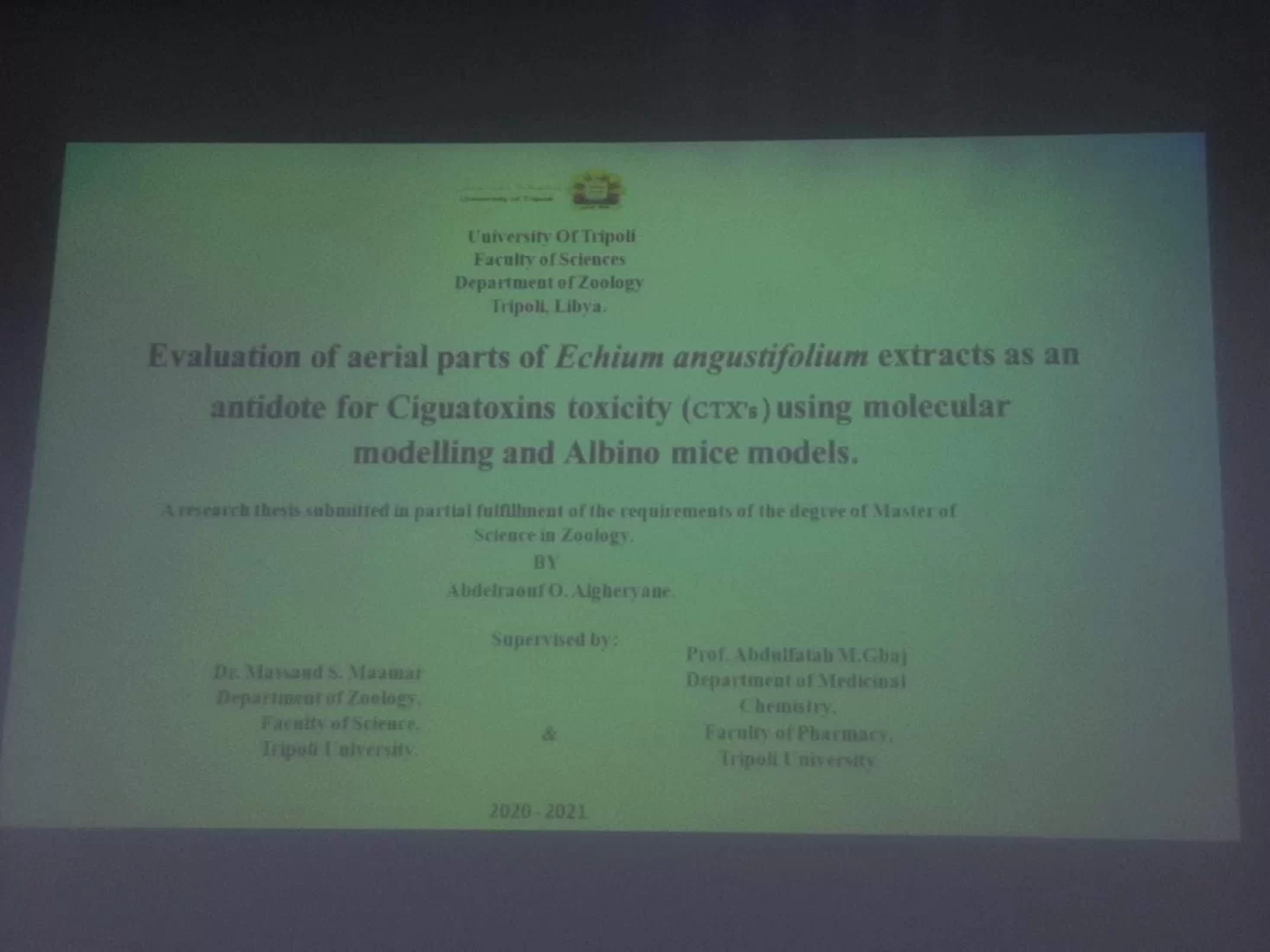 بناءا على قرار السيد رئيس الجامعة رقم (2800) لسنة 2022 ، تم صباح يوم الأحد الموافق 16/10/2022 بقاعه السيمنار بقسم علم الحيوان ، مناقشة رسالة الماجستير المقدمة من طالب الدراسات العليا بقسم علم الحيوان عبدالرؤوف عثمان علي الغرياني وعنوانها: " تقييم تأثير الأجزاء الهوائية لنبات أيك
