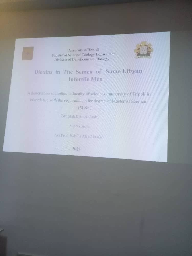 بتوفيق من الله تم يوم الثلاثاء الموافق 2025/6/3 مناقشة رسالة الماجستير المقدمة من الطالب مالك علي العربي بعنوان "الديوكسينات في السائل المنوي لبعض الرجال الليبيين المصابين بالعقم" وقد تكونت لجنة المناقشة من :د. حبيبة علي الجعفري مشرفاً ومقرراًد. عبدالحكيم شعبان النفاتي