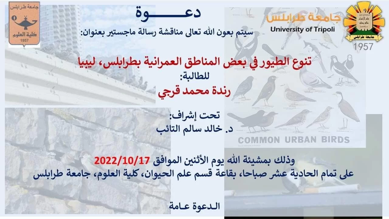 " تنوع الطيور في بعض المناطق العمرانية بطرابلس، ليبيا".