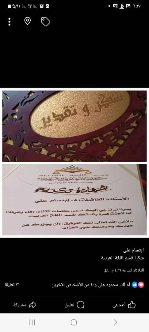 أقام قسم اللغة العربية بكلية العلوم الشرعية تاجوراء ، احتفالية بيوم اللغة العربية العالمي، تضمن العديد من الفقرات، وذلك يوم الثلاثاء 19 _ ديسمبر _ 2023 بمشاركة طالبات القسم ، ونخبة من الشعراء والأكاديميين، واختتم الحفل بتكريم رؤساء القسم السابقين، وأوائل الطلبة للعام2023/2022م، وتكريم شخصية القسم لهذا العام. وسط حضور مميز لأقسام الكلية وإداراتها وطلابها.