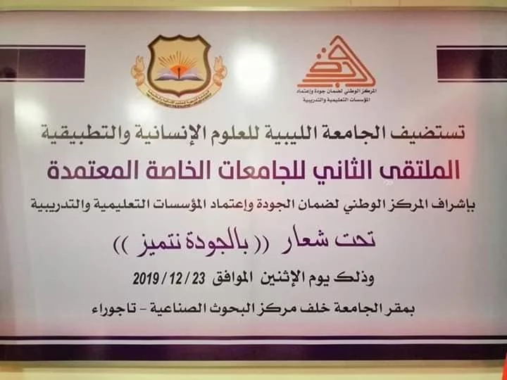بدعوة كريمة من الأستاذ صبري عصمان رئيس مكتب الجودة بالجامعة الليبية للعلوم الإنسانية والتطبيقية شاركت كلية العلوم الشرعية تاجوراء، ممثلة في السيد وكيل الكلية د عبد الفتاح انبيه، ورئيس قسم الجودة د محمد خليل، في الملتقى الثاني للجامعات الخاصة المعتمدة من المركز الوطني لضمان الجودة،