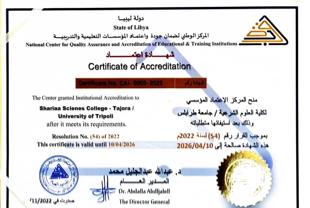 تسلم الكلية شهادة الاعتماد المؤسسي من مركز الوطني لضمان الجودة واعتماد المؤسسات التعليمية