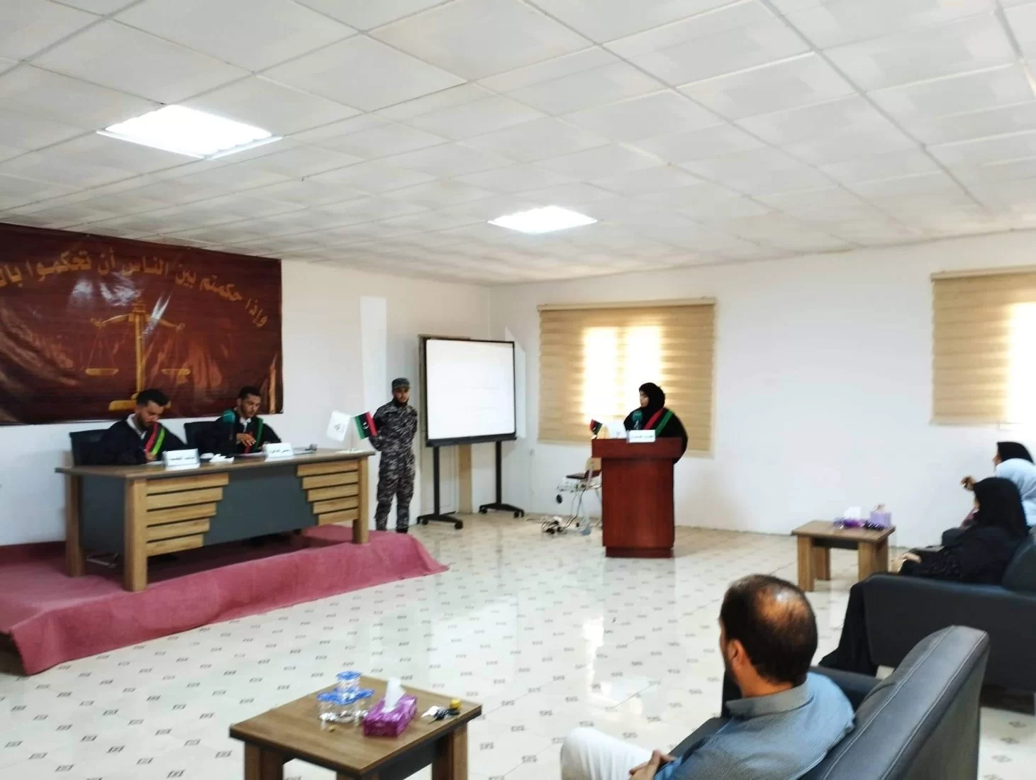 نظم قسم الشريعة والقانون بكلية العلوم الشرعية بتاجوراء هذا اليوم الثلاثاء الموافق 31. 5. 2022 المحاكمة الصورية الأولى، وقام بتنفيذها طلبة قسم الشريعة والقانون تحت إشراف أساتذة القسم، وقد حظيت المحاكمة بحضور ثلة من رجال القانون من أعضاء الهيئات القضائية، وكذلك حضور أولياء أمور الطلبة المشاركين في المحاكمة.وقد نالت المحاكمة إعجاب واستحسان الحضور.بارك الله في اللجنة المشرفة وفي الطلبة المشاركين والمنظمين، وفي كل من ساهم في إظهار هذا العمل بصورة متميزة.