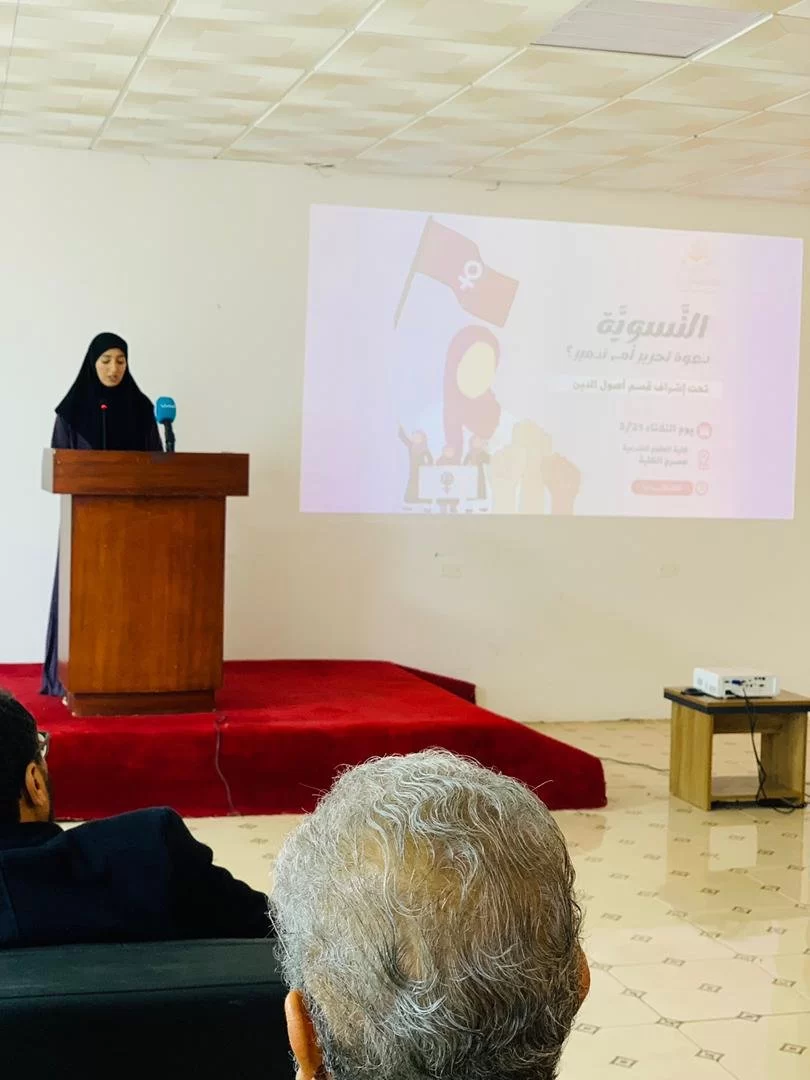نظم قسم أصول الدين بكلية العلوم الشرعية تاجوراء يوم الثلاثاء 21 مارس 2023م ندوة بعنوان "النسوية دعوة تحرير أم تدمير؟!" بحضور لفيف من طالبات الكلية من مختلف الأقسام، وعدد من أساتذتها، وبعض الضيوف.