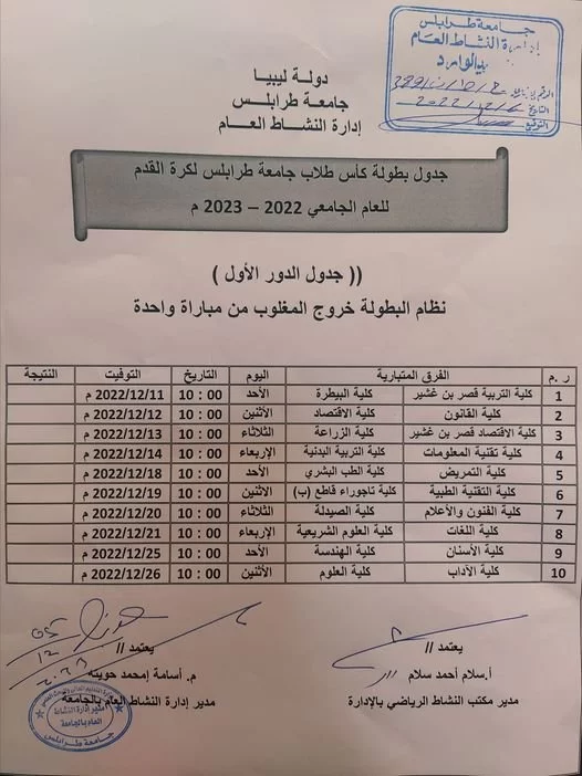 جدول الدور الأول لبطولة كأس طلاب جامعة طرابلس لكرة القدم 2022-2023