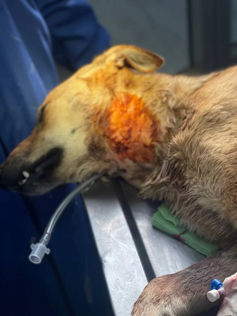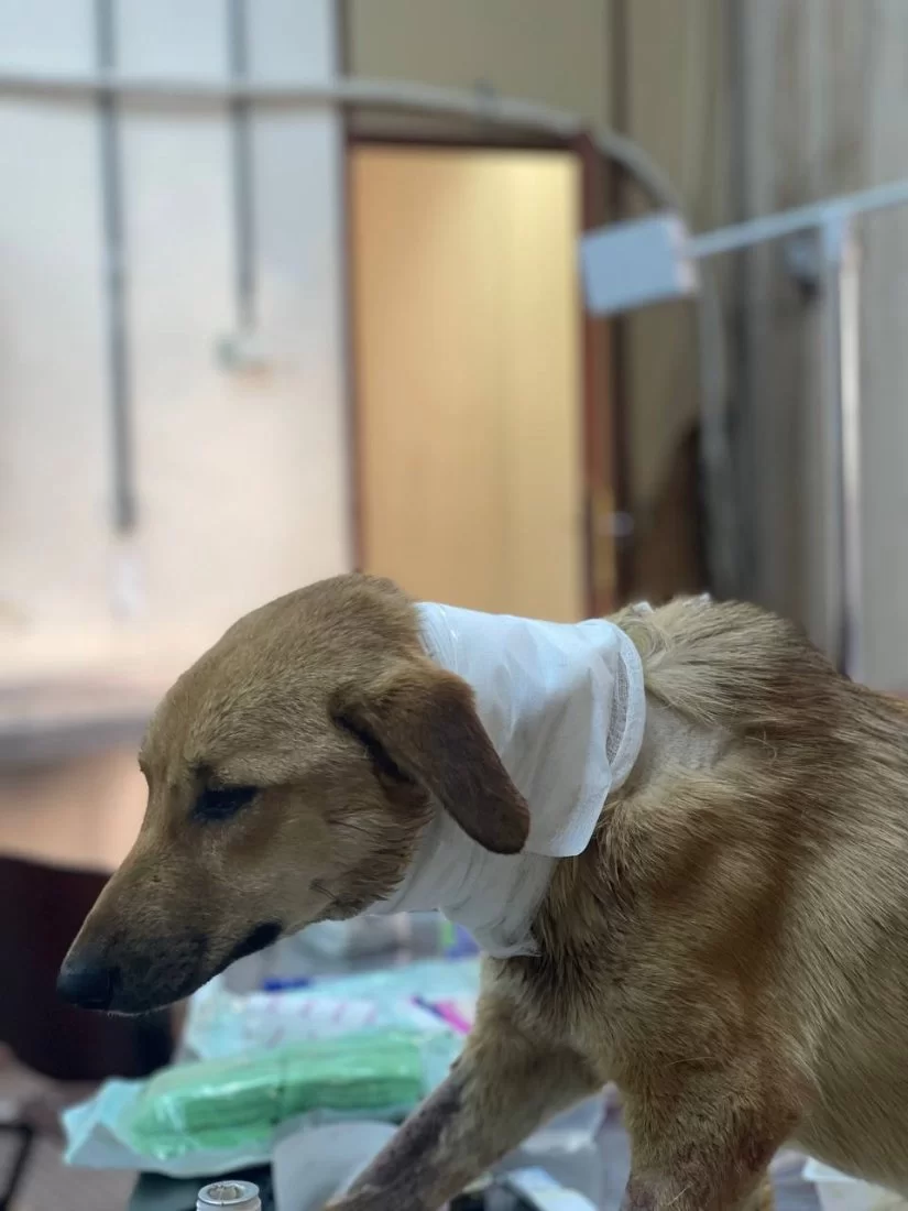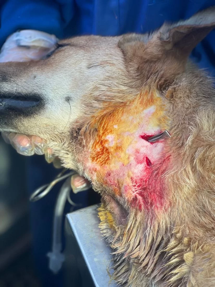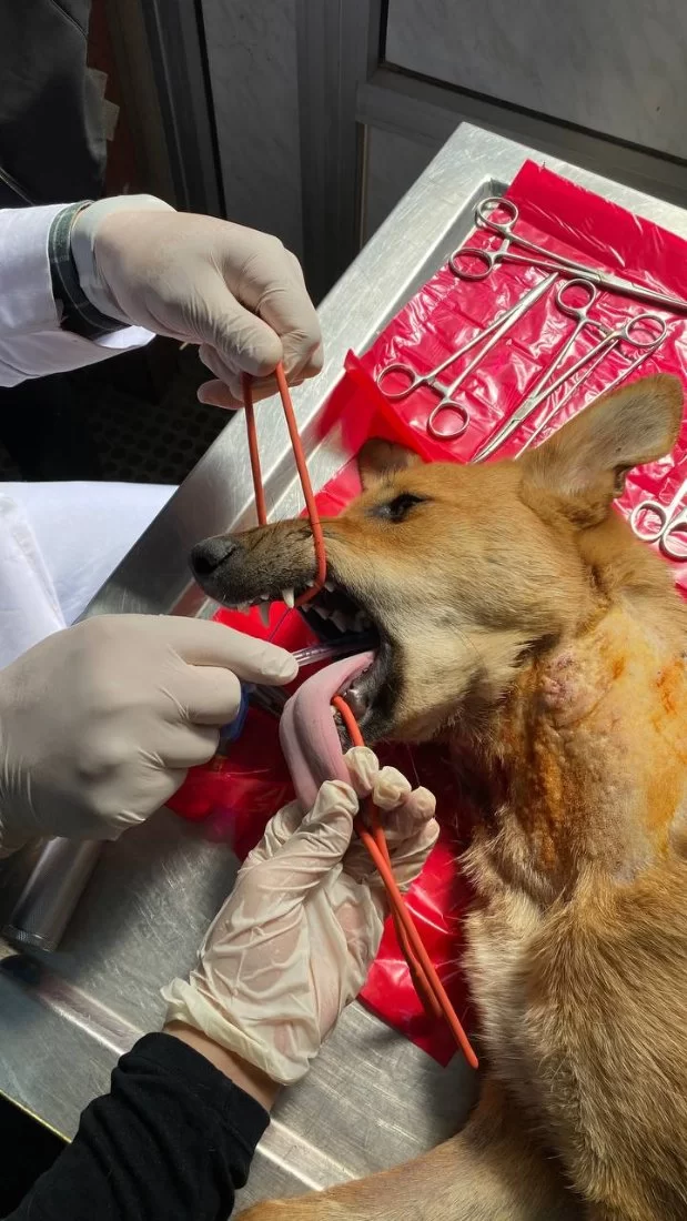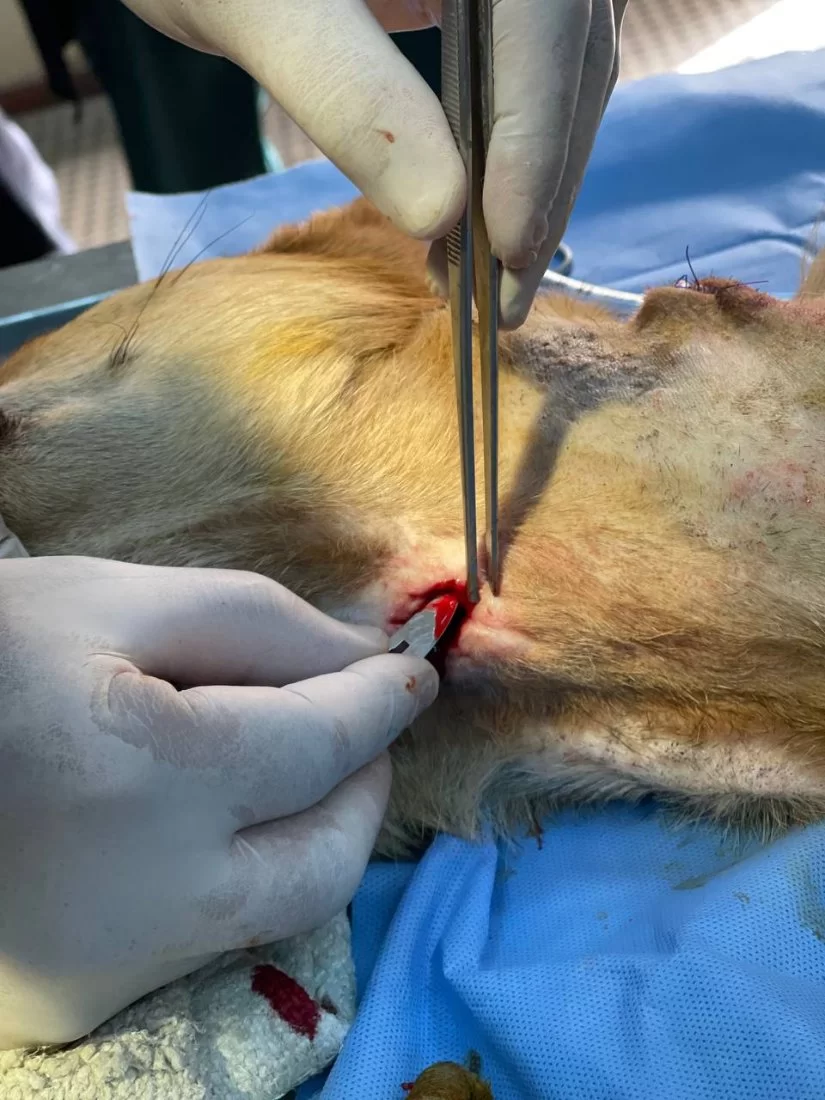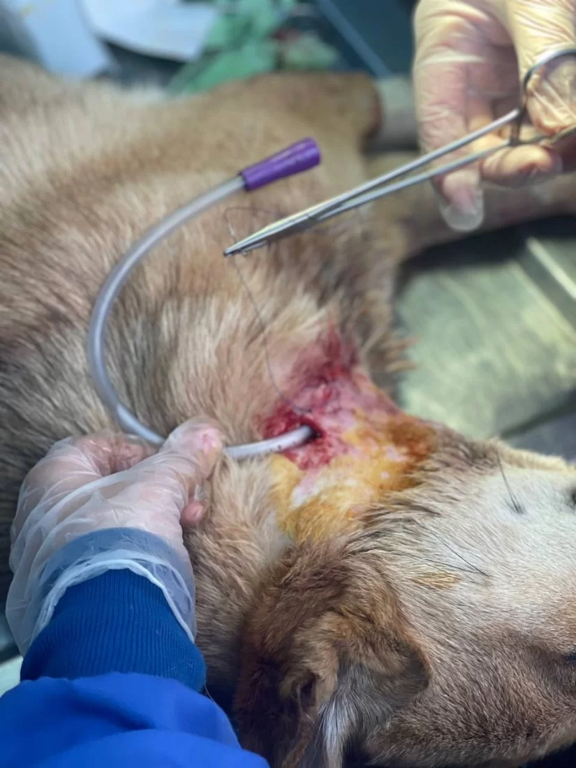 فتح المريء Esophagostomy وادخال انبوب تغذية ( feeding tube) في المريء ( تغيير مسار) لتسهيل عملية تغذية الحيوان وتزويده بالطاقة الازمة ليسترد عافيته دون تعرضه لخطر الاختناق بجزيئات الطعام والماء وايضا لإعطاء فرصة للانسجة المتضررة لتتعافى بشكل اسرع.