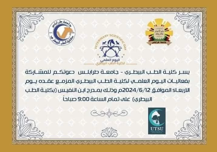 انطلقت يوم امس الإربعاء الموافق12/6/2024 بكلية الطب البيطري جامعة طرابلس فعاليات اليوم العلمي لكلية الطب البيطري، حيث شارك مجموعة من طلبة السنة الثالثة والرابعة بأبحاث علمية قاموا بانجازها تحت اشراف أعضاء هيئة تدريس بالكلية.