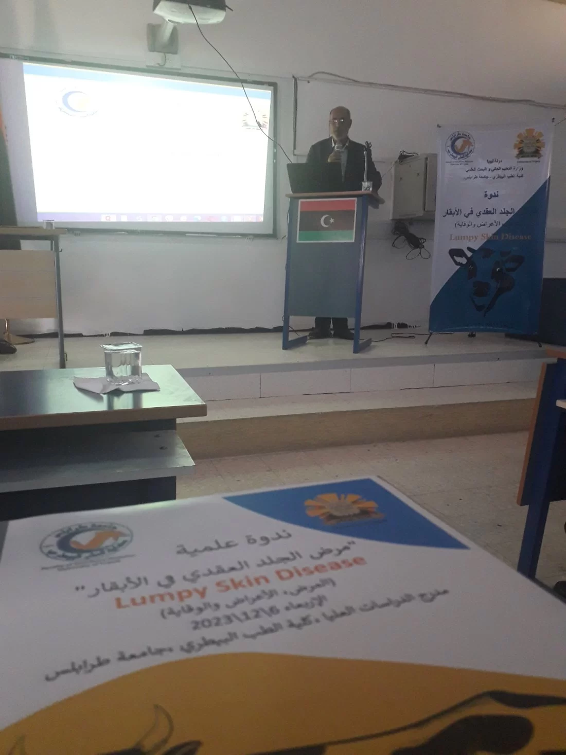 أقيمت صباح اليوم الموافق 06/12/2023 ندوة علمية حول مرض الجلد العقدي في الأبقار( lumpy skin disease ) بقاعة الدراسات العليا بكلية الطب البيطري جامعة طرابلس. استجابةً للتقارير حول ظهور بؤر وبائية للمرض في الآونة الأخيرة في أنحاء متفرقه على المستوى الوطني. قامت كلية الطب البي