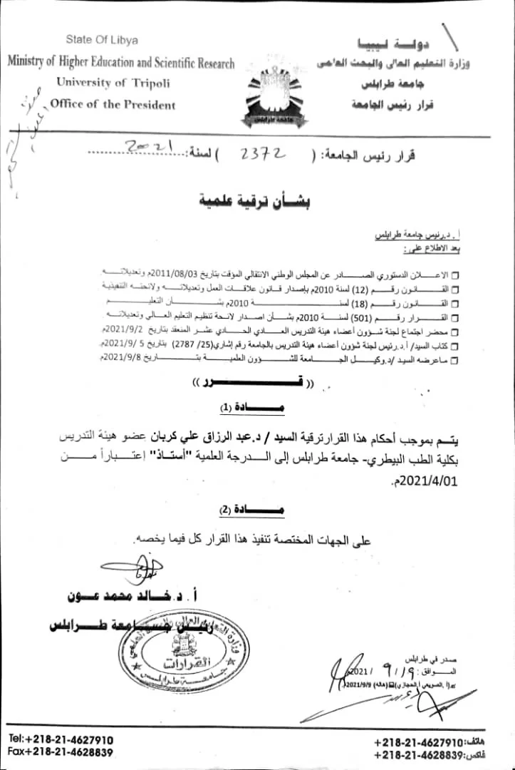 فقد تكلل سعيكم وتلقينا خبر ترقيتكم أ.د. عبدالرزاق كربان إلى الدرجة العلمية " أستاذ" .... النجاح