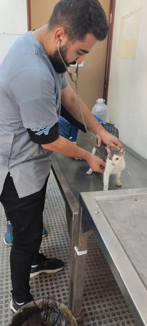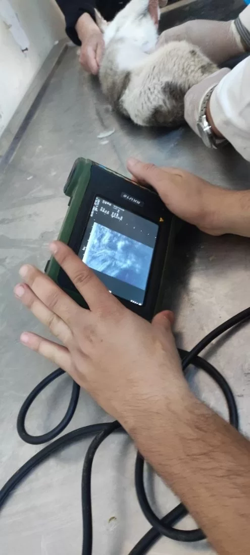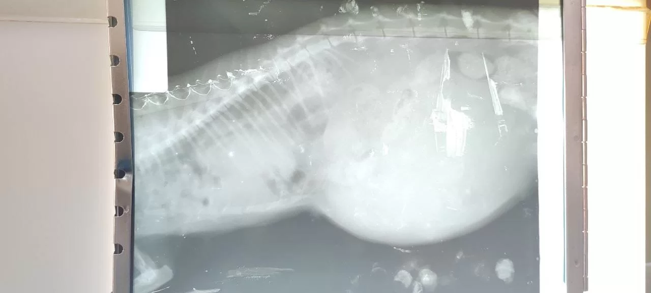 يوم الثلاثاء الموافق 6.6.2023 أُحيلت لقسم الجراحة كلية الطب البيطري قطة عمرها 7 سنوات وهي حامل و تعاني من أعراض تنفسية.. تم إجراء فحص سريري و لوحظ إن القطة تعاني من صوت غير طبيعي في الرئتين. وتم تصوير الصدر والبطن بالأشعة السينية التي أوضحت أن القطة تعاني من تمزق في الحجاب الحاجز و يظهر وجود أجزاء من الامعاء داخل القفص الصدري. وتم إجراء فحص بجهاز الموجات فوق الصوتيةultrasound scan. والتي أوضحت إن الرحم يحتوي على أكثر من جنين في حالة جيدة. و تم إبلاغ صاحبه بضرورة متابعة ومراقبة الحالة وإحضارها للكلية أو لأقرب عيادة بيطرية. إذا حدث أي طاريء.